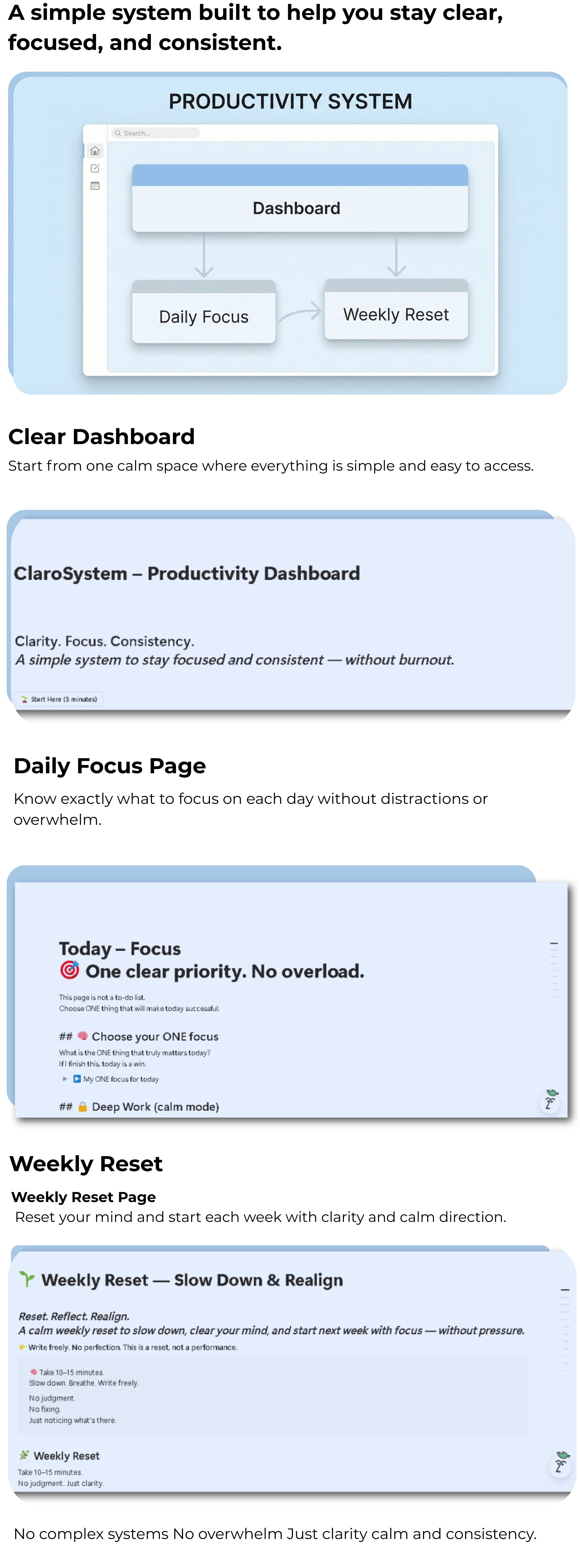 “Before ClaroSystem, I always felt overwhelmed. Now I open Notion and instantly know what to do. It feels calm.”